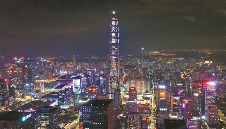 4月23日,京基100大厦、平安金融中心、汉国中心、华润春笋大厦、深圳湾一号等地标纷纷亮灯,滚动显示“每天息屏一小时 读书运动爱自然”。 深圳特区报记者 周红声 摄